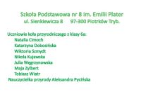 - Uczniowie koła przyrodniczego Szkoły Podstawowej nr 8 im. Emilii Plater w Piotrkowie Trybunalskim pod opieką pani Aleksandry Pycińskiej;