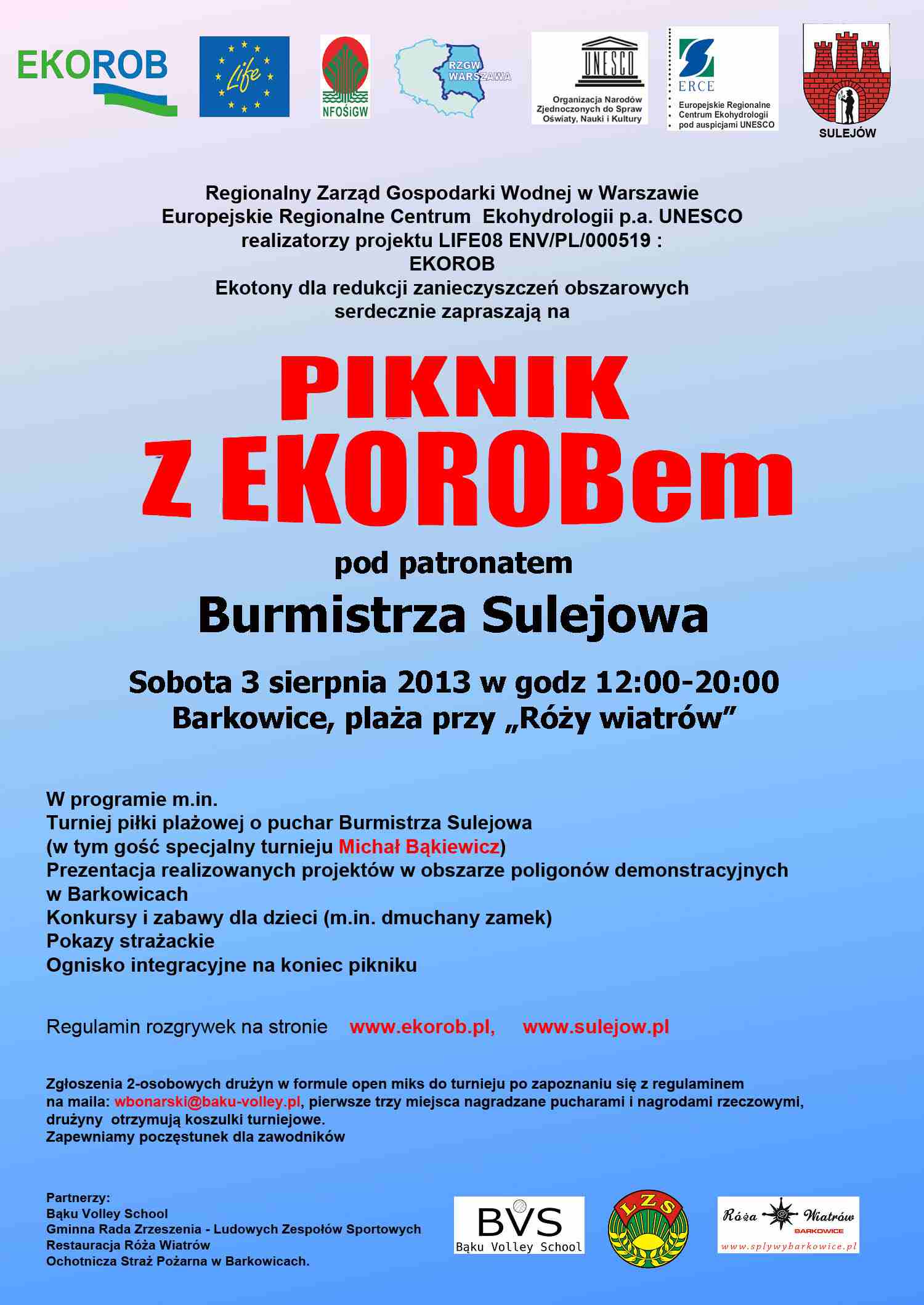 Regionalny Zarząd Gospodarki Wodnej w Warszawie wraz z Europejskim Regionalnym Centrum Ekohydrologii PAN serdecznie zapraszają na Piknik z EKOROB- em pod patronatem Burmistrza Sulejowa w sobotę 3 sierpnia 2013 w godz 12-20 Barkowice, plaża przy „Róży wiatrów”